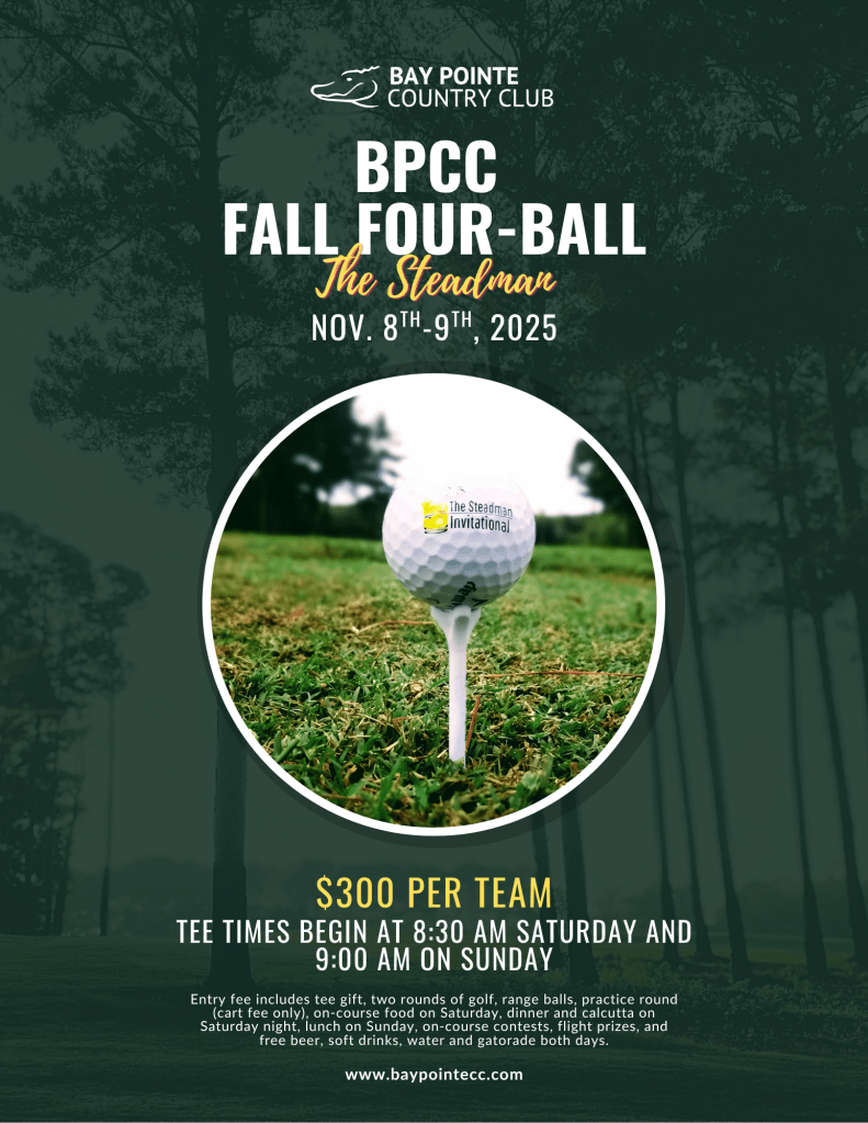 BPCC FALL FOUR-BALL “The Steadman” returns next month! Join us on Saturday, November 8th and Sunday, November 9th for our annual four-ball. Entry fee is $150 per player/$300 per team. Entry fee includes a complimentary tee gift, practice round (cart fee only), range balls, two rounds of golf with carts, food and drinks both days, Saturday night dinner and calcutta, on-course contests and flight prizes. Sign up today by calling the golf shop at (601) 724-1408 or register online here: