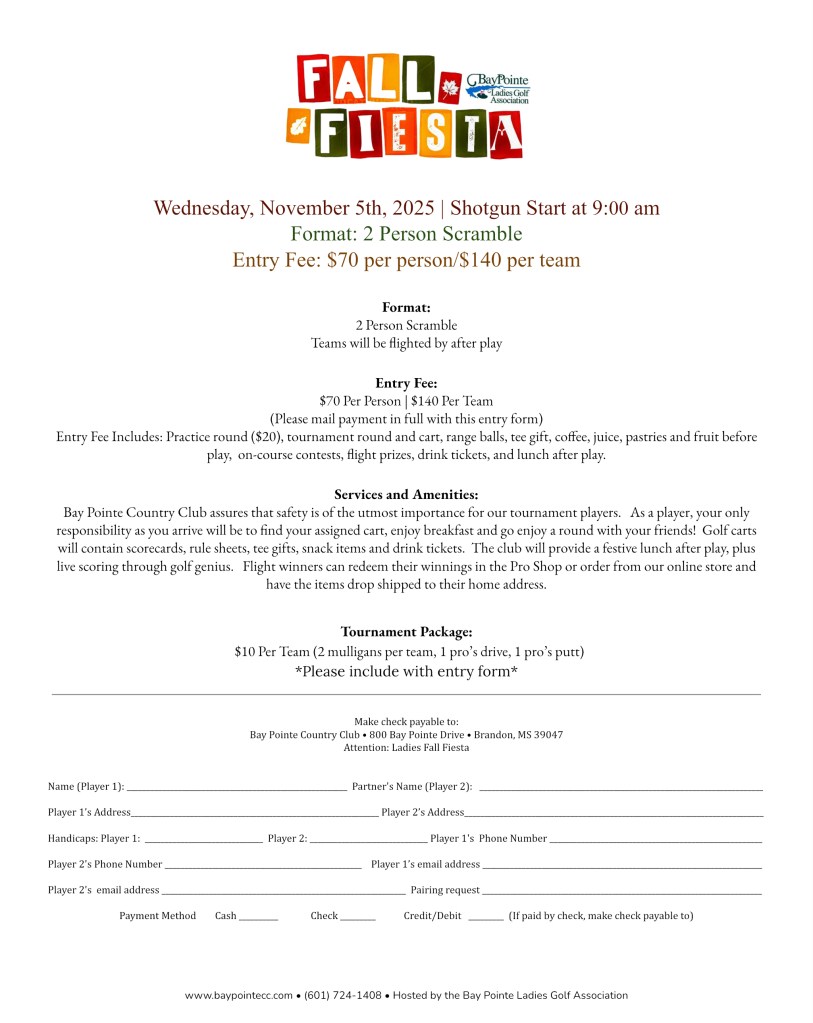 DOWNLOAD PDF FLYER Ladies Fall FiestaDownload PDF REGISTER ONLINE Please enable JavaScript in your browser to complete this form. HDCP Phone Email Name *FirstLastPhone #Email *HDCP IndexName *FirstLastPhone #Email *HDCP IndexSubmit